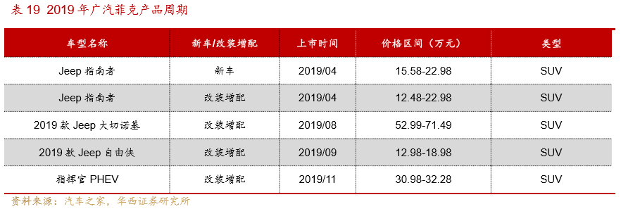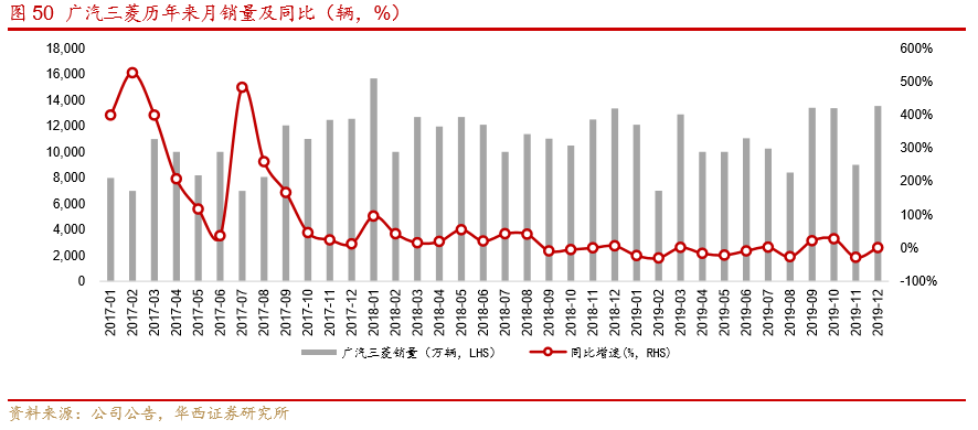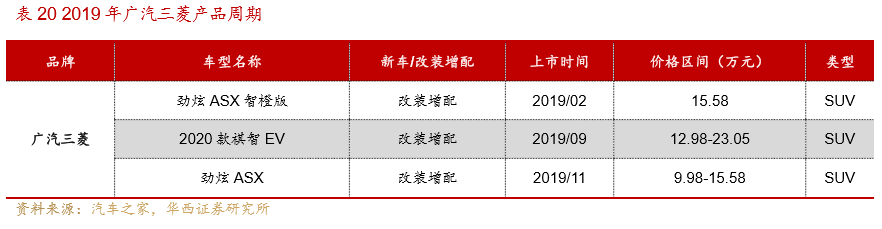 广汽三菱产品周期改款为主。考虑到行业下行收窄以及广汽三菱于2019年产品周期中积极对车型进行改装增配,广汽三菱预计在2020年销量稳定于1万辆左右。