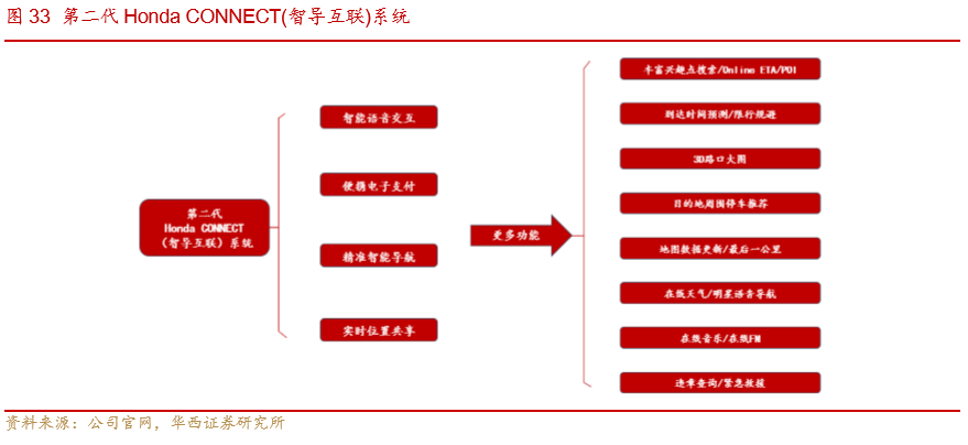 本田在中国市场的智联化布局如火如荼。第二代Honda CONNECT(智导互联)系统整合了阿里巴巴、高德的新技术,从2019年起搭载到新产品上,更适合中国市场。第二代Honda CONNECT(智导互联)系统包含智能语音识别、在线支付、智能导航、车辆位置共享等功能,强化了实时拥堵信息等在内的导航功能。同时,本田正与阿里巴巴、科大讯飞合作研发第三代Honda CONNECT系统,第三代系统会导入天猫精灵和科大讯飞智能语音识别技术。与阿里巴巴的合作,将会有助实现车与住宅的无缝互联,也会打造车内电子商务互联环境。而本田和科大讯飞的合作也将打造人与车的深度对话环境,实现出行服务和体验的升级。
