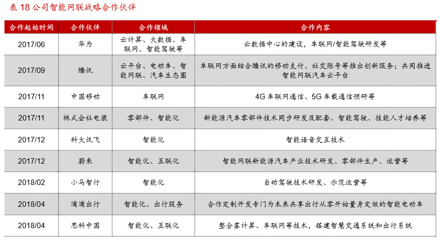 打通整车厂与消费者的中间环节,增强用户体验。此外,广汽新能源还开创了“线上+线下”的全新营销服务模式:线下由“体验中心”、“展示中心”、“社区服务站点”构成,线上通过APP连接线下,打通整车厂与车主的中间环节。 智联化方面,广汽集团亦布局周密。公司先后与华为、腾讯、蔚来、中国移动、科大讯飞、思科中国、滴滴出行等公司签署战略合作协议,并主导研发了智能出行系统ADiGO。ADiGO作为智驾互联生态系统,涵盖了“ADiGO自动驾驶系统”与“ADiGO智能物联系统”两大功能板块,未来将持续引入ADiGO云平台、ADiGO大数据平台等子系统。其中,“ADiGO(智驾互联)生态系统”已搭载在Aion LX上,并在未来陆续搭载在广汽传祺的车型上。