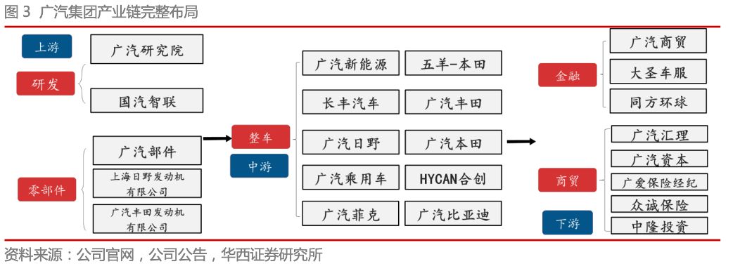 广汽集团产业链布局完整。业务涵盖整车及零部件研发、制造、汽车商贸服务、汽车金融等,是国内产业链最为完整的汽车集团之一,也是国内汽车行业首家拥有保险、保险经纪、汽车金融、融资租赁、财务等多块金融行业牌照的企业集团。