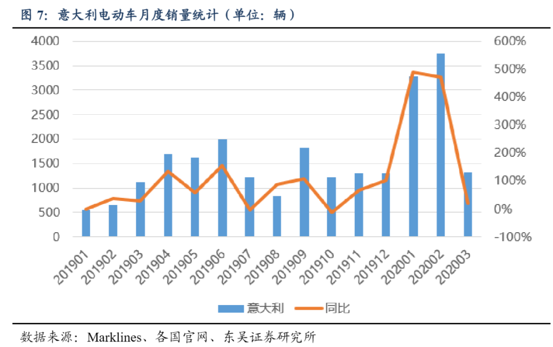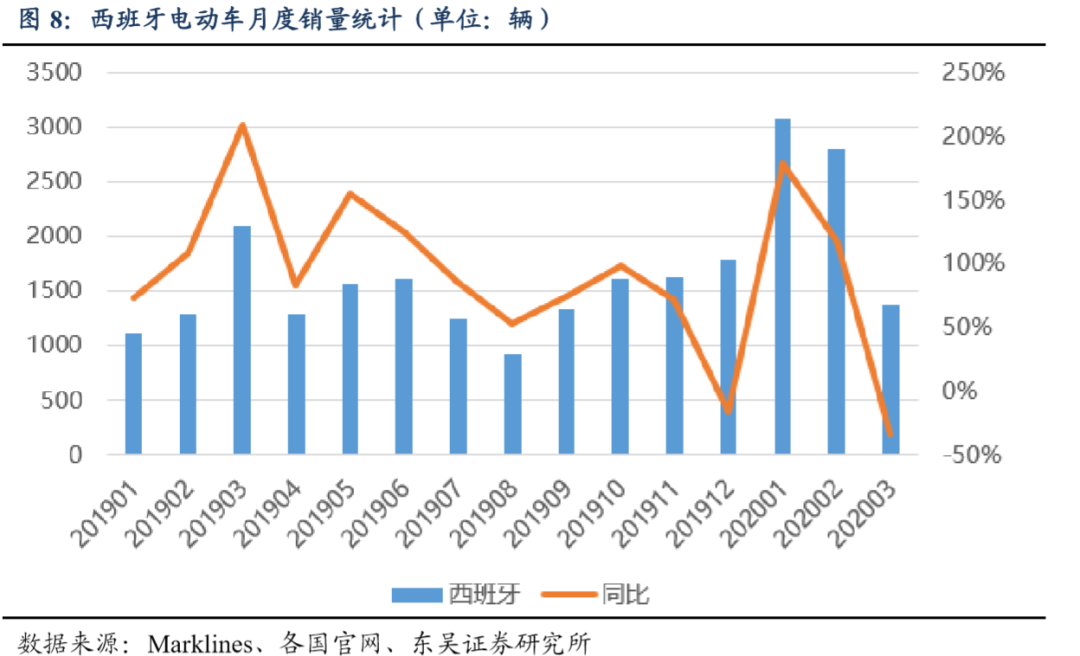 意大利、西班牙 3 月公共卫生事件爆发,销量严重下滑。意大利 3 月传统乘用车注册 2.88 万辆,同环比-86%/-82%;电动车注册 1324 辆,同比增长 22%,环比大幅下降 65%,1-3 月乘用车累计 34.82 万辆,其中电动车累计 8357 辆,同比+272%,增量主要来自 1-2 月 份,渗透率为 2.4%。西班牙 3 月传统乘用车注册 3.8 万辆,同环比-70%/-60%;电动车 注册 1368 辆,同环比双双下降,为-36%/-51%,1-3 月传统乘用车累计销量 21.83 万辆, 其中电动车 7253 辆,同比+60%,增量主要来自 1-2 月份,渗透率为 3.3%。