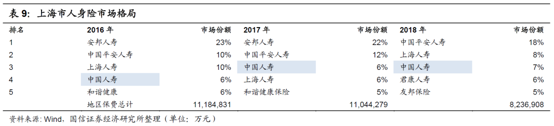 在上海市,中国平安亦是如此,其市场份额在2016年为10%,在2018年为18%,远高于中国人寿对应的6%和7%,即使中国人寿在2018年的市场份额排名为第三,如下表所示。