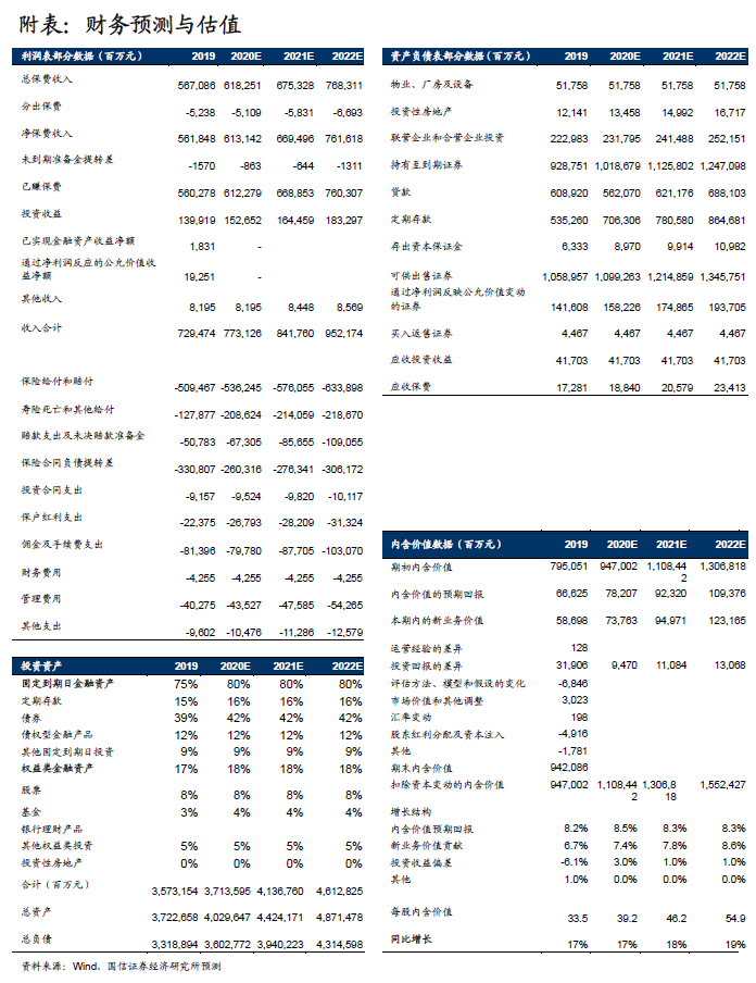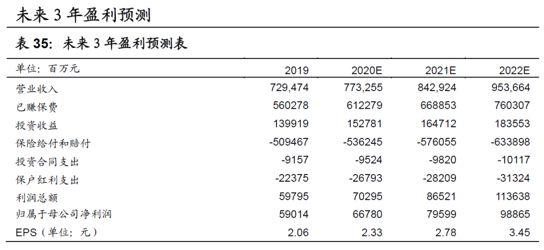 因为我们对集团在20/21年内含价值的预测为38.2/44.6元,所以集团对应20年的目标股价为38.2-53.48元,对应21年的目标股价为44.6-62.4元。