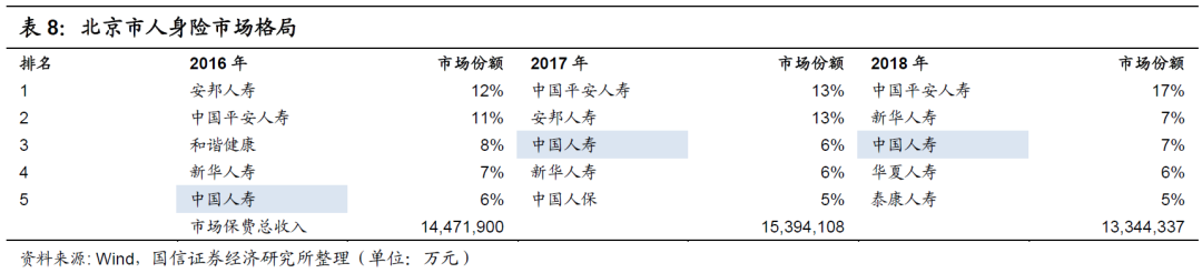 在北京市,中国平安的市场份额在2016年为11%,在2018年为17%,远高于中国人寿和新华人寿个位数的市场份额,如下表所示。