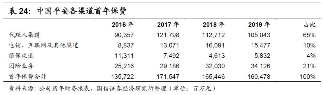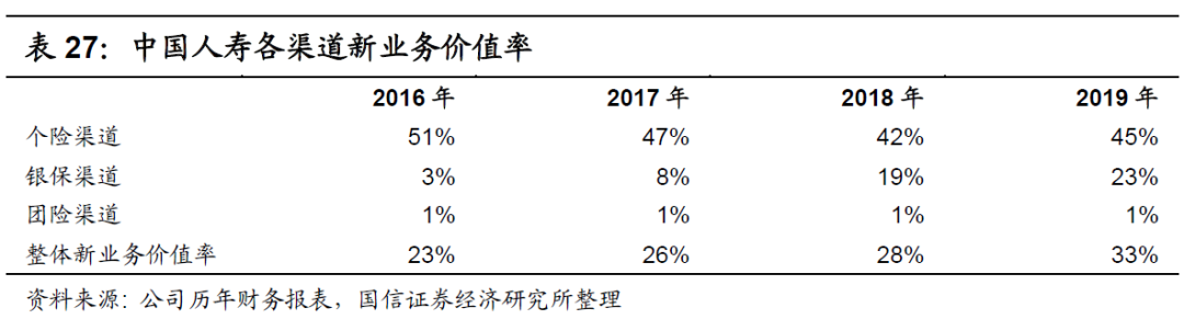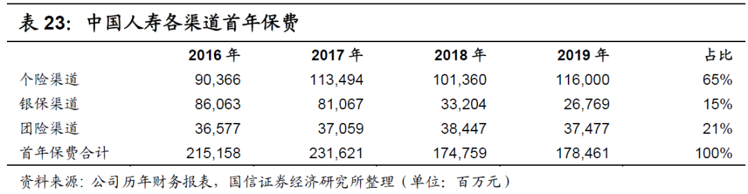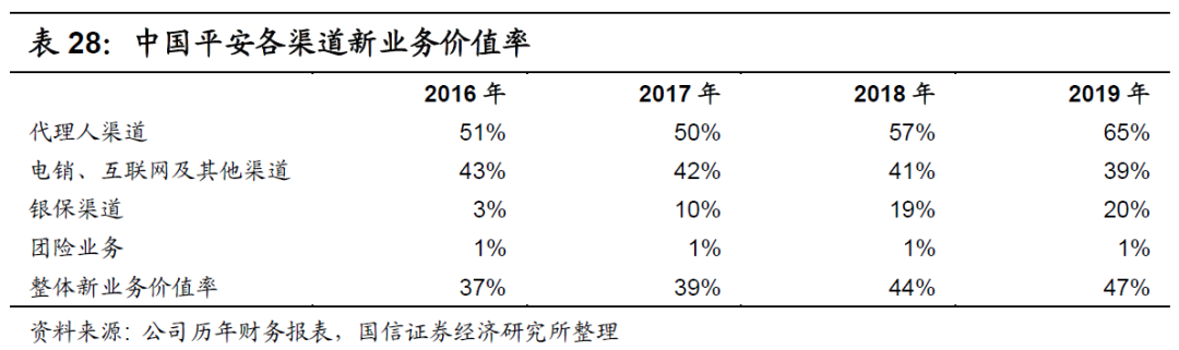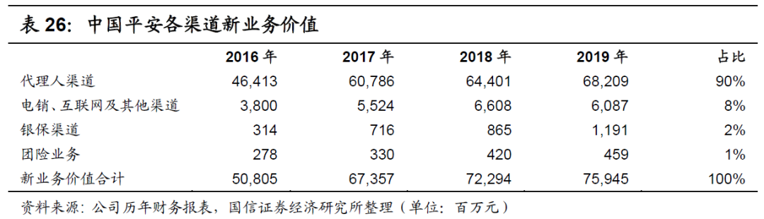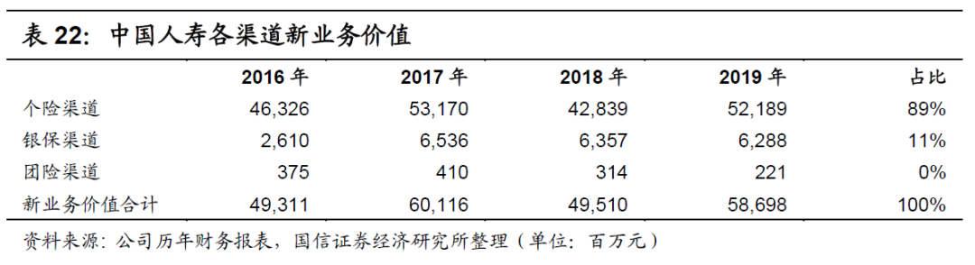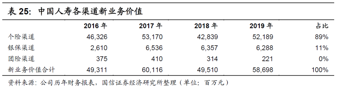 在首年保费占比基本相同的情况下,新业务价值占比亦基本相同,如下表所示。在2019年,中国人寿的代理人渠道占比为89%,与中国平安的90%相近,其中团险渠道的占比皆接近1%,其余渠道的占比皆接近11%。