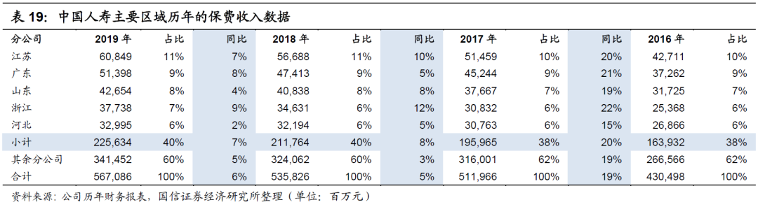 中国人寿的整体表现在2019年十分靓丽,价值增速显著,同时规模亦保持迅速的扩张。但根据各区域的情况来看,各区域的表现还是参差不齐,其中山东省和河北省的同比增速仍明显落后于整体平均增速,分别为4%和2%,远低于整体增速的6%,同时其余分公司的规模增速为5%,亦不及整体的表现。