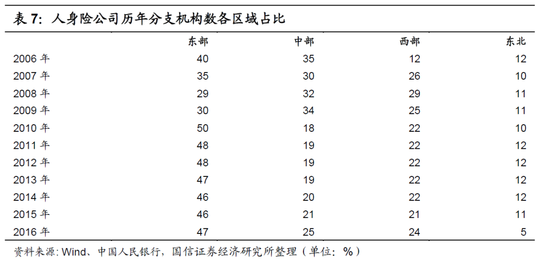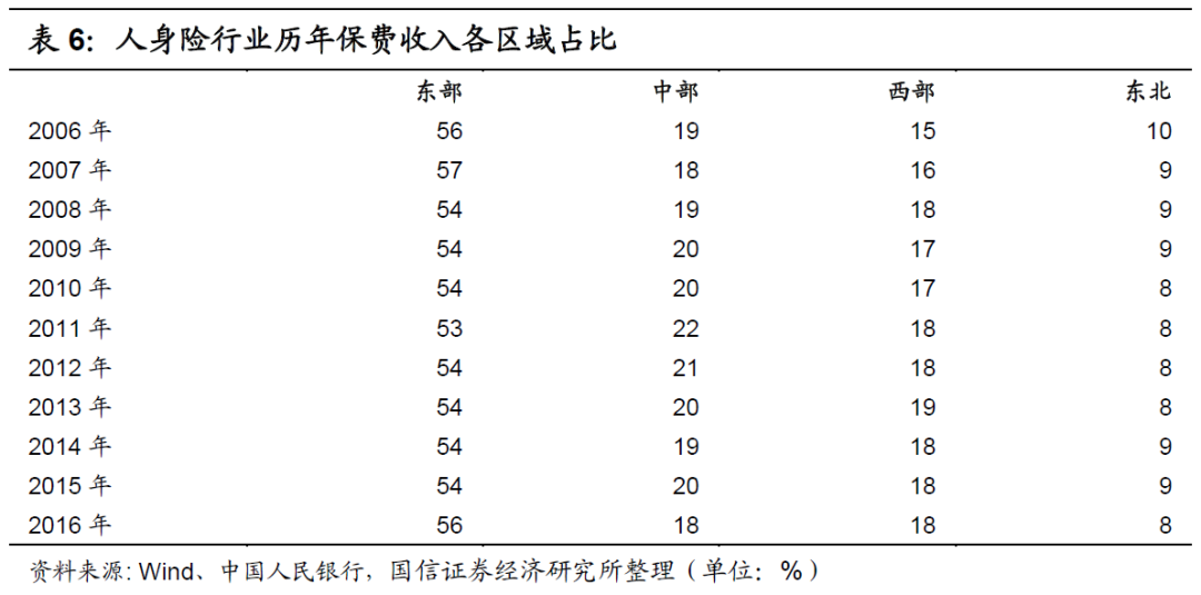 (2)东部竞争激烈,中西部成长性更为凸显:我国人身险行业整体的市场份额历年来较为集中于东部市场区域。东部区域的人身险保费占比历年来都接近于60%,大于50%,中部区域和西部区域的保费收入占比皆接近于18%,较为平均,而东北部区域的保费收入占比历年来低于10%,如下表所示。