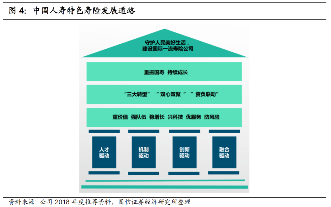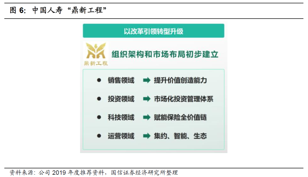 鼎新工程:中国人寿启动了基于“重振国寿”战略目标引领下的“鼎新工程”,对公司未来变革转型进行全面规划。通过“鼎新工程”,国寿将构建新的发展布局,提升价值创造能力;建立市场化投资管理体系,提升投资收益水平;强化科技驱动和运营支撑,提升公司整体效能;完善市场化激励约束和人才发展机制,增强队伍活力。