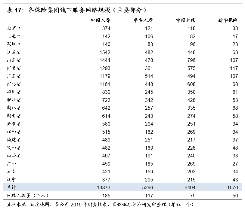 但在另一方面,在部分保费规模较小的省份,中国人寿的服务网络规模较小,这也解释了在上文中,中国人寿在相应省份的保费收入规模被平安人寿所超越的现象。