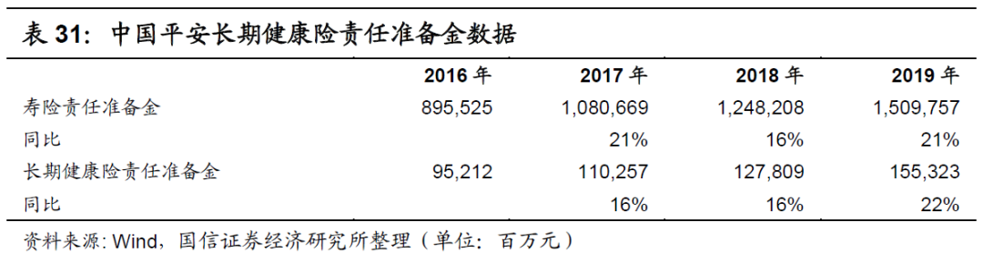 中国人寿近年来大力发展长期保障型业务,产品结构日益多元,在2019年首年期交前十大主销产品中6款为保障型产品。如下表所示,中国人寿的长期健康险责任准备金在近年来增长迅速。