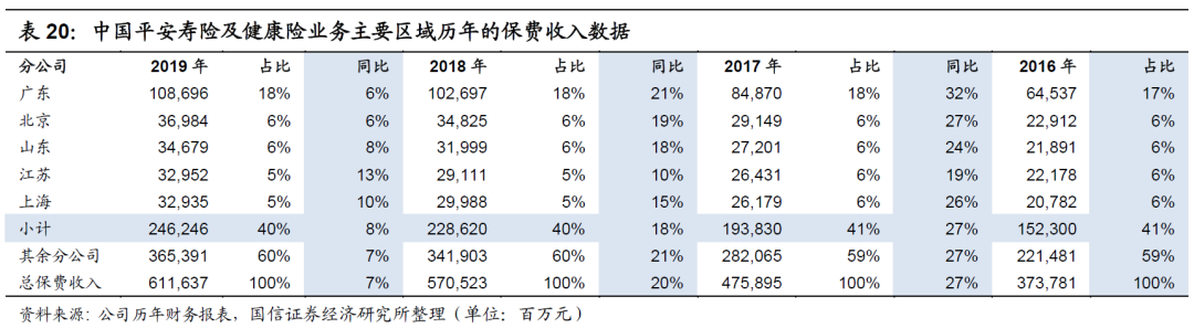 相比较而言,中国平安的人身险业务各区域的表现则更为整齐。在2019年,整体保费收入增速为7%,其中增速最低的主要区域为广东省和北京市,但也都在6%左右,而其余分公司的增速为7%,稳定了整体保费增速。