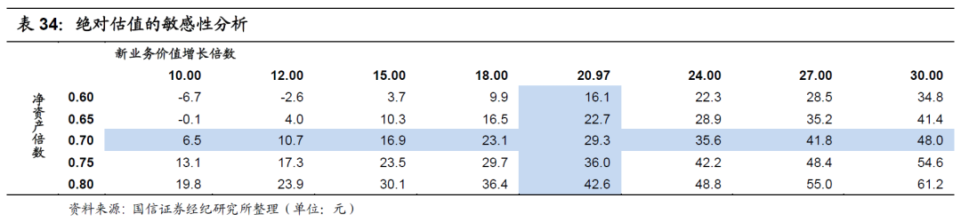 我们对股价进行敏感性分析,主要以新业务价值倍数和调整后净资产倍数做为主要变量。
