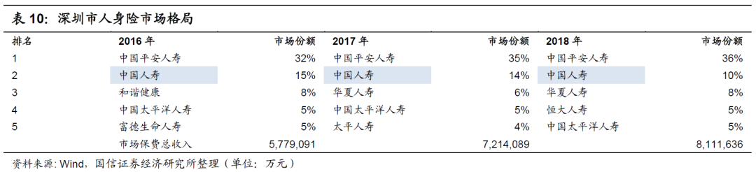 在深圳市,中国平安作为东道主,更无疑是行业第一,其市场份额在2016年为32%,在2018年为36%,远高于中国人寿对应的15%和10%,即使中国人寿历年来的市场份额排名为行业第二,如下表所示。