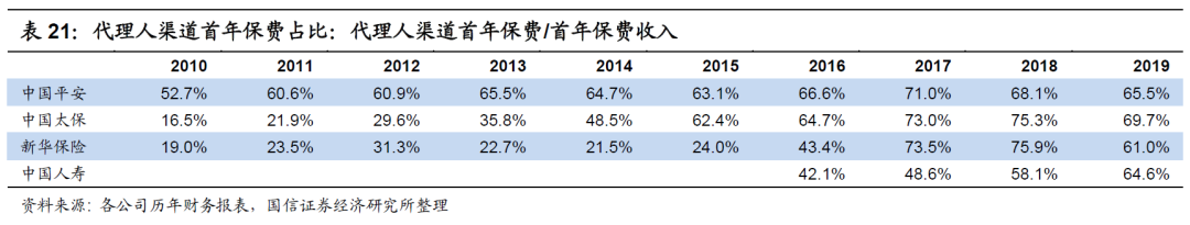 如中国平安,其代理人渠道的首年保费占比从2010年开始便稳居50%以上,每年逐步提升,至2019年的68.1%,而其余寿险企业代理人渠道的首年保费占比在2010年则皆在20%上下。
