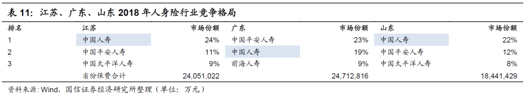 大型市场省份:国寿主场,远超同业。我们选取有代表性的大型市场省份,如江苏、广东及山东等省份,分析其竞争格局以及中国人寿的行业地位。