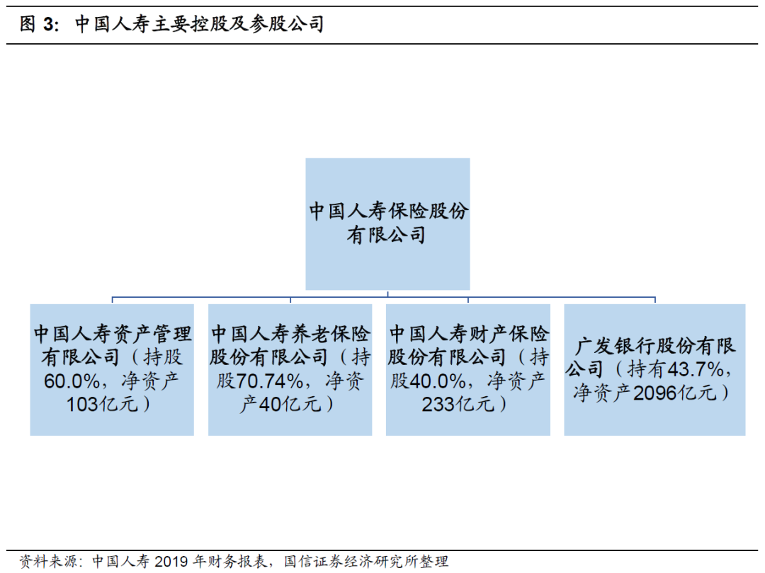 主要控股及参股公司:公司主要的控股及参股业务涉及资管业务、养老业务、产险业务以及银行业务。根据公司2019年财务报表,中国人寿控股中国人寿资产和中国人寿养老,而广发银行和中国人寿财险属于联营企业,其中中国人寿财险由集团公司控股,而中国人寿则是参股。