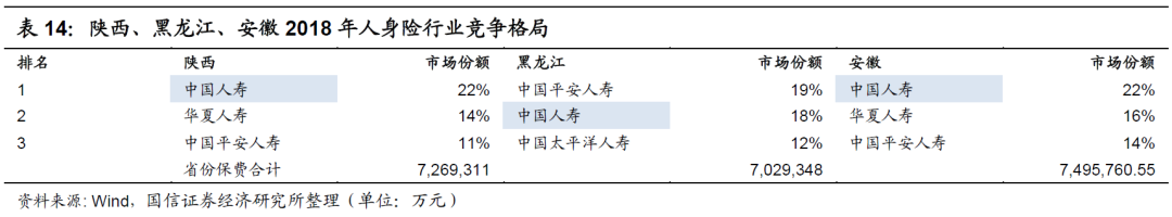 基于对全国局势的了解,我们再近距离分析部分具有代表性省市的竞争格局,以了解中国人寿的区域布局。