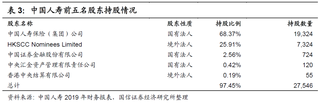 根据中国人寿2019年的财务报表,如下表所示,集团公司持股数量达到193亿股,占A股总数量的93%,占总股数的74%。同时,前五名股东的持股数量达到275亿股,约占总股数的97%。综上所述,A股的实际可流通盘规模并不大,将近6.6亿股。