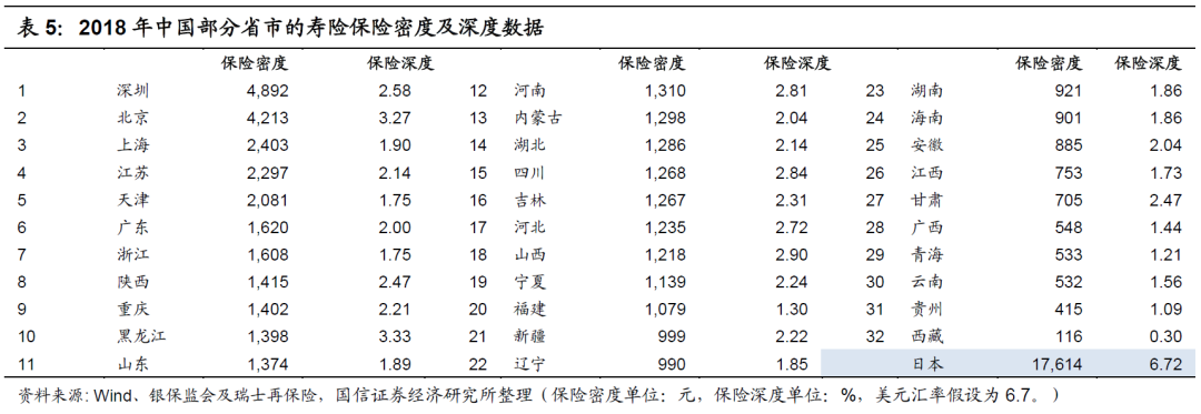 (1)经济发展程度影响人身险行业规模:如下表所示,典型的一线城市,如深圳、北京和上海等市,经济较为发达,其保险密度明显高于全国其余省市。再比如经济较为发达的省份,如广东、江苏及浙江等省,其保险密度要普遍远高于其余省份。