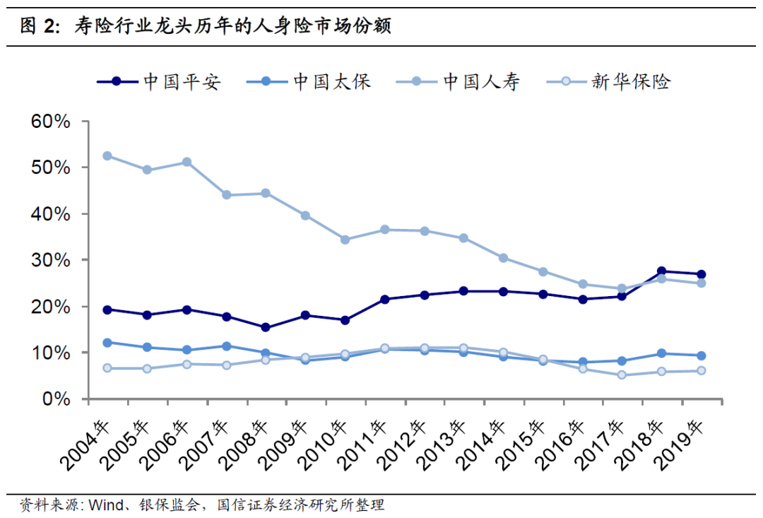行业地位:公司历年来在人身险行业的市场份额位列第一,直至2018年和2019年被中国平安超越。在2019年,寿险行业的保费收入达到2.27万亿元,其中中国人寿达到5684亿元,中国平安的保费收入达到6116亿元,中国太保达到2124亿元,新华保险达到1381亿元,其市场份额分别是25%、27%、9%、6%,合计达到67%。