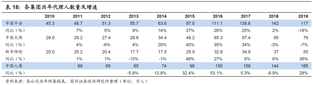相比较而言,中国人寿拥有绝对多的代理人数量,同时其代理人数量增速在2019年逆势而上,如下表所示,体现出其线下网络规模的绝对优势。