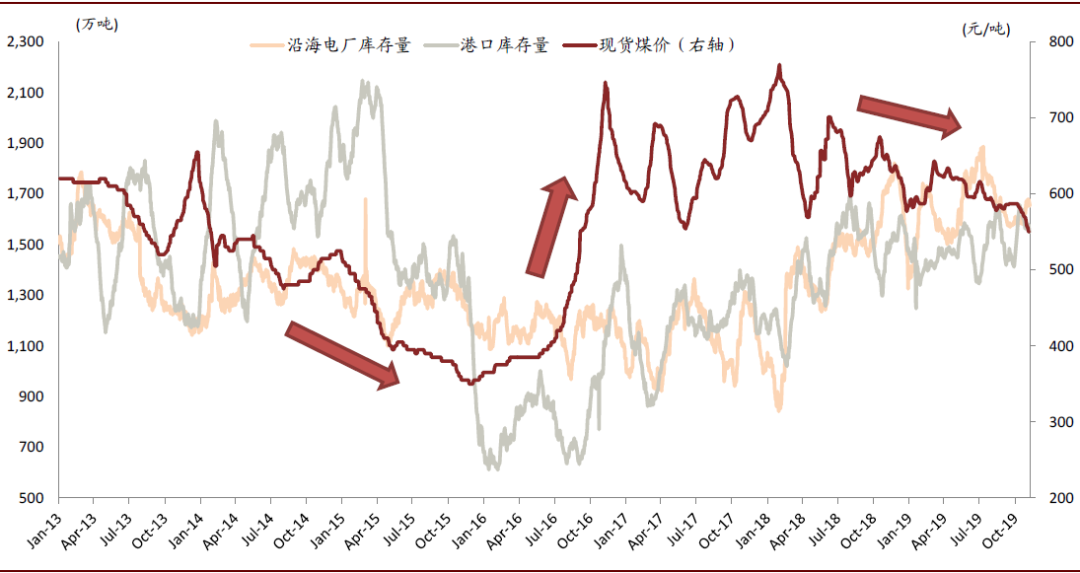 图表: 电厂、港口煤炭库存vs.动力煤现货煤价(2013-2019)