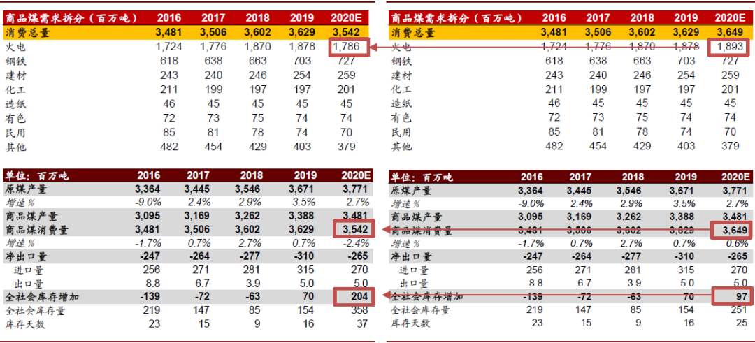 图表: 煤炭供需平衡(左图为以新电量预测推算;右图为原预测)