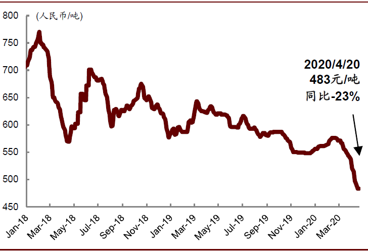 由于海外卫生事件影响叠加4月气候回暖及来水增强,动力煤采购需求较弱使得现货价在过去一个月下挫12%至483元/吨,当前同比-23%。我们认为电企有望利用当前煤价形势签订较为有利的长协合同。全年来看,考虑到工业用电受卫生事件影响将出现明显下滑,我们下调2020年全国用电增速至1.0%(原预测:4.4%),预计煤电发电量将同比-4.9%(原预测:+3.0%)。