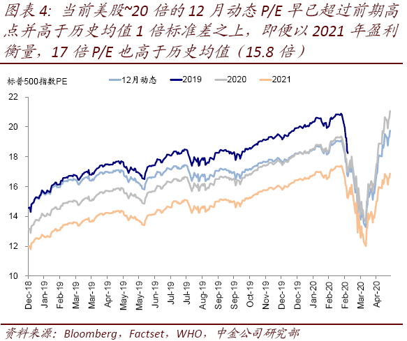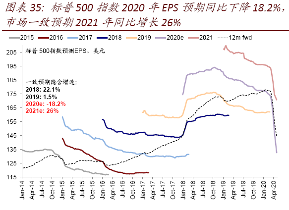 究其原因,2~3月全球金融市场动荡的源头来自公共卫生事件对企业现金流的巨大冲击,并被金融机构一度放大为流动性危机(《公共卫生事件升级的金融传导机制及“薄弱环节”排查》)。应对上述问题,美联储政策不断加码特别是3月23日决定购买信用债有效缓解了流动性紧张的局面(《美联储再加码;市场或进入基本面下行的第二阶段》);而多轮财政纾困(美国国会已推出四轮累计3万亿美元的救助计划)、公共卫生事件峰值出现、以及目前欧美逐渐开启的复工进程则有望帮助受损企业的现金流修复,虽然我们认为这仍将是一个渐进和反复波折的过程。实际上,上述条件的出现也正是市场虽然面临盈利大幅下修和一个个刷新纪录的经济数据下依然能够大幅反弹的原因。