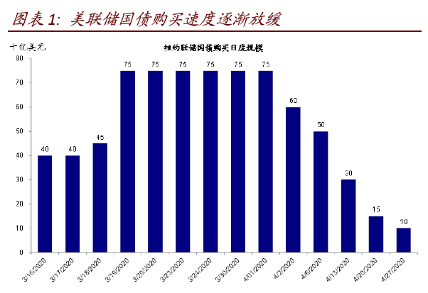 另一方面,政策支持与预期的边际增量在减缓,例如纽约联储日度购债速度从3月底以来持续在降低;美联储4月FOMC按兵不动,尽管仍有“弹药”但未来一段时间内可能进入政策观察期;随着欧美公共卫生事件拐点的确认和复工逐渐开启,市场关注点从预期复工也会转向复工进展是否顺利、以及是否会造成公共卫生事件的反复。