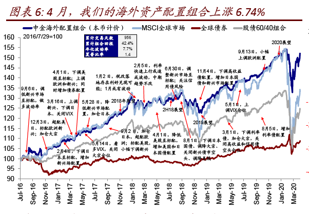 4月,我们的海外资产配置组合上涨6.74%(本币计价),表现弱于全球股市(11.8%,MSCI全球指数,美元计价)和股债60/40组合(8.11%),但好于大宗商品(0.34%,标普大宗商品指数)和全球债市(2.58%,美银美林全球债券指数,美元计价)。自2016年7月成立以来,该组合累积回报52.1%,夏普比率1.6(图表6)。分项看,得益于市场的企稳修复,美股、新兴和欧洲股市是我们组合最大的收益来源,不过由于我们除新兴市场外维持标配因此导致相对收益不及股市指数;相比之下,VIX和高收益债空头是我们组合4月的主要拖累(图表7~8)。