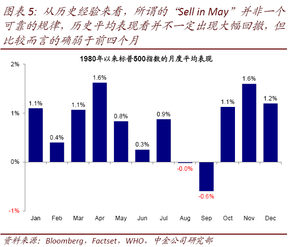 ►“5月卖出”并非一个可靠的历史经验,但平均表现的确弱于前四个月。从历史经验看,所谓的“Sellin May”并非一个可靠的规律,历史平均表现看并不一定出现大幅回撤,但比较而言的确弱于前四个月。考虑到4月的大幅反弹,不排除出现一定的获利了结。