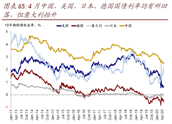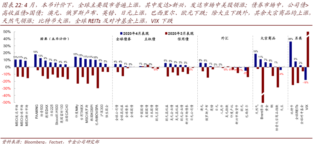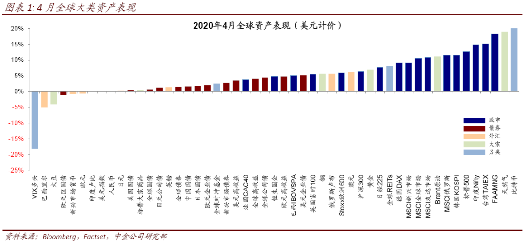 4月,1)跨资产:股>债>大宗;2)权益市场:发达好于新兴;发达中,美国>日本>欧洲(本币);新兴中,阿根廷、泰国、印度领涨,而印尼、中国AH股落后;3)债券市场:利率底部震荡,但意大利国债利率明显抬升;信用利差高位回落;通胀预期抬升;4)大宗商品:美油WTI期货一度跌至创纪录的负值,但天然气大涨;黄金和金属普遍反弹;农产品中仅棉花上涨;5)汇率:美元反复震荡收平;欧元和新兴汇率收跌,但压力较3月缓解;6)另类资产,VIX大跌,比特币和REITs反弹。