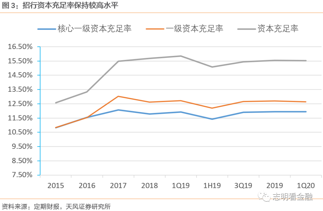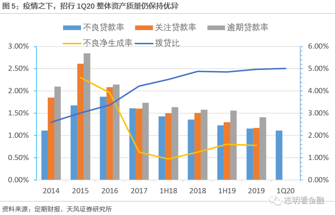 不过,公司贷款受公共卫生事件影响较小,1Q20招行本体(非集团)公司贷款不良率1.72%,较年初下降33BP;逾期率1.74%,较年初下降29BP。公司贷款质量改善的改善,使得总体资产质量仍保持优异。1Q20集团不良贷款率1.11%,较年初下降5BP;拨贷比5.01%,较年初上升4BP。
