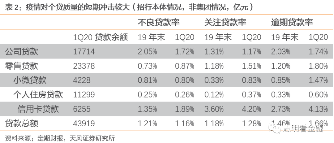 公共卫生事件对个贷质量短期冲击明显。公共卫生事件之下,招行本体(非集团)1Q20零售贷款不良率/关注率/逾期率为0.87%/1.51%/1.80%,较年初上升14/33/60BP,冲击明显。其中,信用卡贷款1Q20不良率1.89%,较年初上升54BP。