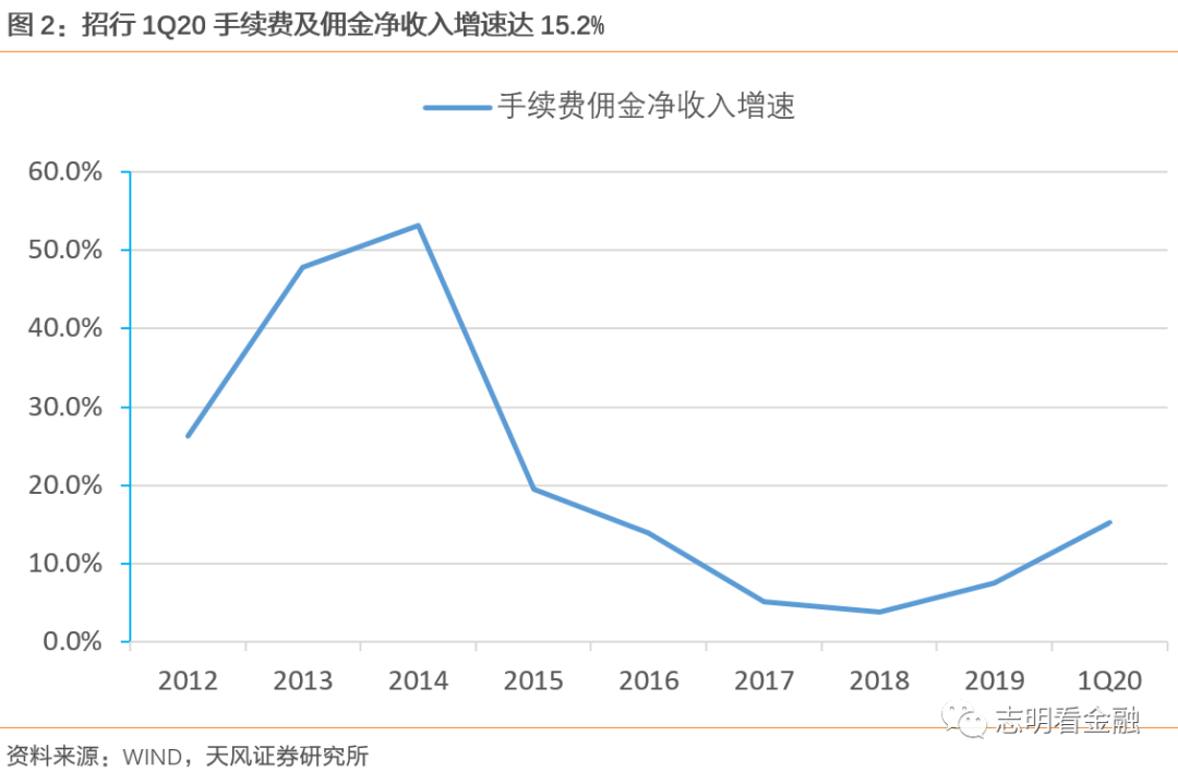 营收增速上升。1Q20营收增速11.4%,较19年的8.5%明显上升,考虑到公共卫生事件影响,营收增速好于预期。一季度营收增速改善源于资产扩张提速及中收发力。1Q20资产规模同比增速14.3%,较19年末的10.0%提速明显;1Q20手续费及佣金净收入增速达15.2%,较19年的7.5%大幅上升。