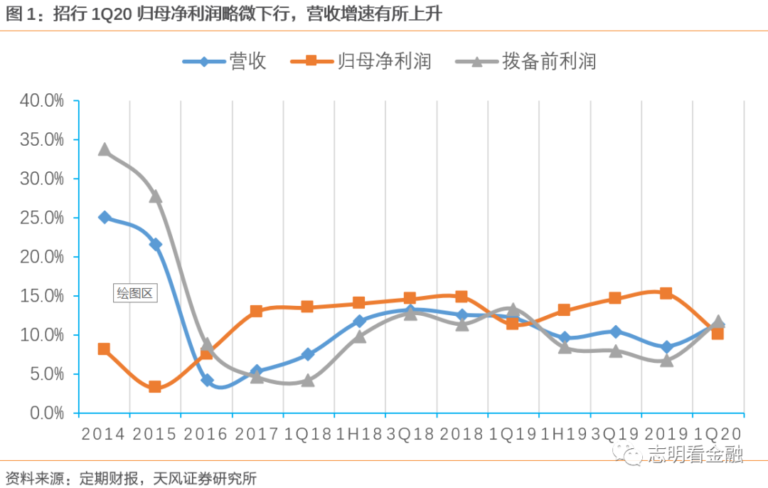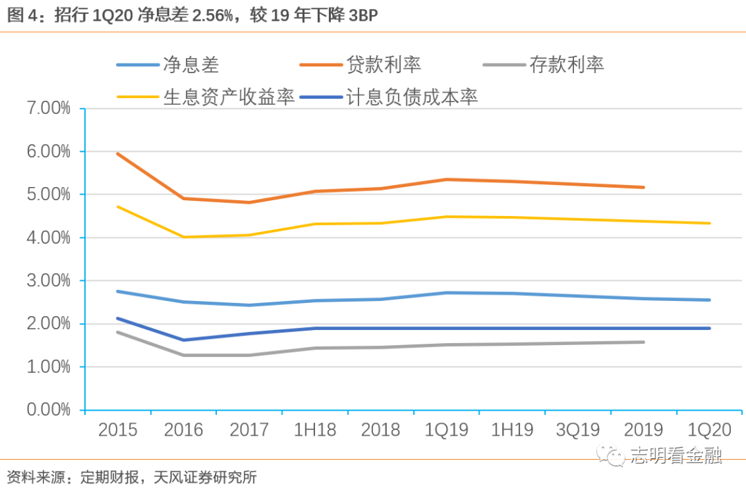 盈利增速略微下行。1Q20归母净利润增速10.1%,较19年的15.3%有所下降,但仍保持较高水平。主要是公共卫生事件之下,1Q20主动加大了拨备计提力度。1Q20年化加权平均ROE达18.76%,居A股上市银行前列。