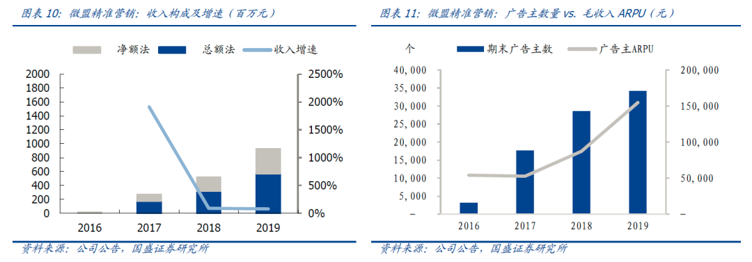 近年微盟精准营销的付费用户数与ARPU高速增长。2019年公司精准营销的广告主数量增长至34,142家,广告主ARPU大幅增长77.4%至15.5万元。公司精准营销收入确认采用总额法和净额法两种方式。从毛收入角度,2019年毛收入为52.8亿元,同比增长111.9%;其中总额法确认的毛收入约6.7亿,净额法确认的毛收入约46.1亿。从收入角度,总额法和净额法收入各贡献5.7亿和3.6亿。
