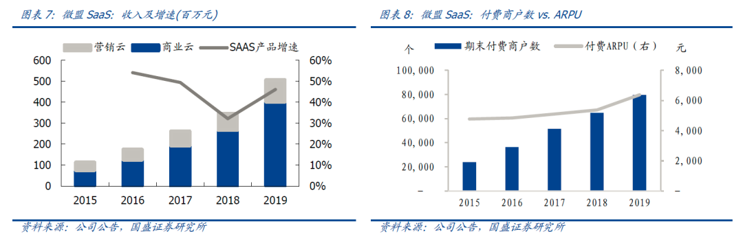 2019年,微盟集团SaaS收入约5.07亿,同比增长46%;其中,包含微商城、智慧零售、智慧餐饮等产品在内的商业云业务收入约4亿,贡献了SaaS收入的近80%。微盟SaaS产品的付费用户数与ARPU均保持稳步增长;截至2019年公司SaaS产品的付费商户数增长23%至79546个,SaaS产品的ARPU增长18.8 %至6373元。
