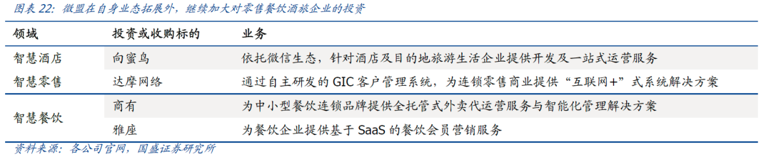 微盟作为微信长期的合作伙伴,一方面通过自身积累的智慧零售、智慧餐厅、微盟外卖等业务资源来为线下美业、餐饮、零售、酒店等行业的商家开设微商城、并提供潜在的代运营、营销等解决方案;另一方面更是通过投资和收购,联合向蜜鸟、达摩网络、商有、雅座等服务商来完善其线下酒店、零售、餐饮服务体系。