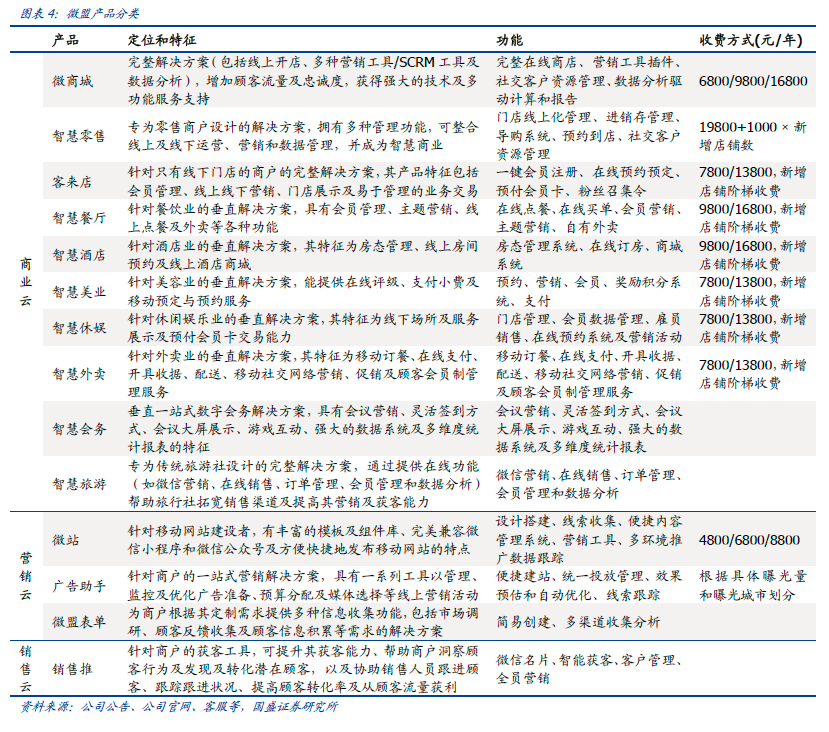 微盟的SaaS产品收入约80%来自商业云,约20%来自营销云。微盟的商业云重点布局电商、零售、餐饮、本地生活和酒旅等行业,推出了微商城、智慧零售、客来店、智慧餐厅、智慧酒店等一系列智慧商业SaaS产品,帮助商家实现微信生态的商品销售和客户服务。营销云则包含微站、广告助手、微盟表单。销售云产品主要包含销售推。