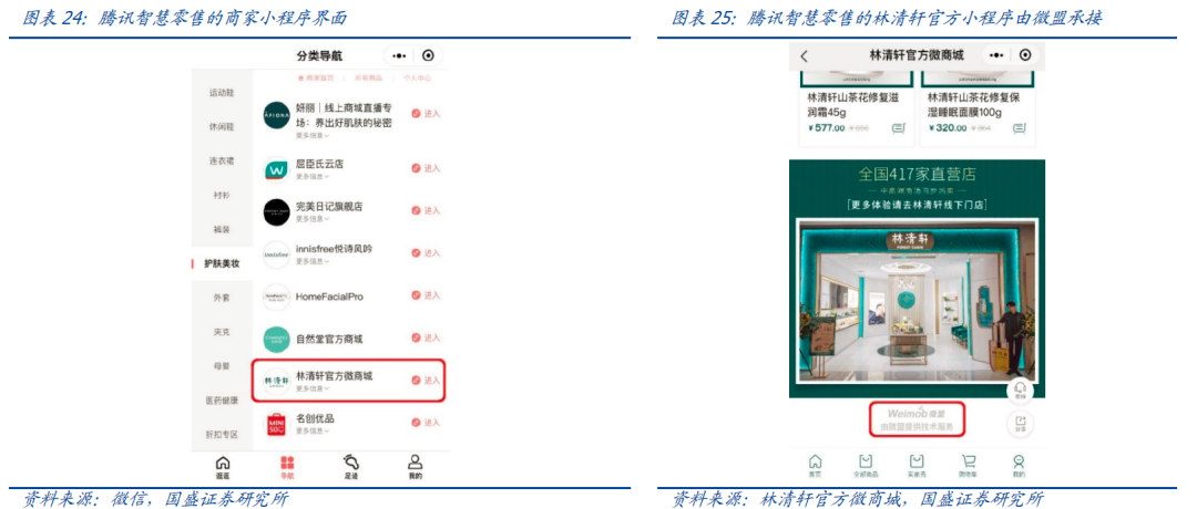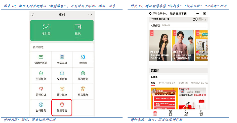目前微信的“智慧零售”试点已经在福州、深圳和北京展开,深圳已有近五十个品牌商家通过小程序接入智慧零售;我们预计,未来会有更多零售品牌商家接入,通过微信的高流量低成本的商业生态进行带货变现。