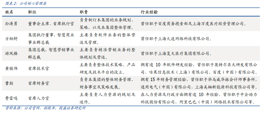 微盟集团管理层有着丰富的软件营销及研发管理经验。公司创始人兼CEO为孙涛勇,曾任职于百度商务搜索部及上海万度医疗投资管理公司。公司执行董事兼智慧商业事业群总裁方桐舒、总裁兼智慧营销事业群总裁游凤椿,分别负责软件业务、精准营销业务的整体营运管理,均拥有丰富的软件运营及营销经验。曹懿、黄骏伟、费雷鸣分别为首席财务官、首席技术官和首席人力官,在财务、研发、人力资源管理等领域专业经验丰富。
