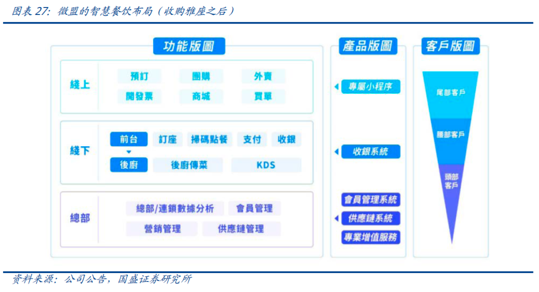 此外,2020年2月19日,微盟披露计划以1.14亿元人民币认购无锡雅座在线科技股份有限公司63.83%股权。雅座成立于2006年,目前在餐饮行业耕耘超过14年,是餐饮会员营销的开创者,致力于为餐饮企业提供基于SaaS的餐饮会员营销服务,雅座业务覆盖 29 个省 318 个城市的 8 大业态、58 个子业态,服务门店突破 100 万家,餐饮百强中 43 家是雅座的客户。此前微盟的餐饮解决方案主要针对线上,通过本次对雅座的收购,微盟将成功切入线下,不仅能为现有中长尾客户提供智慧餐饮服务,更能弥补微盟在服务中大型餐饮客户方面的短板,打造出集会员、收银、外卖、点餐、预订、供应链管理的一站式智慧餐饮解决方案。