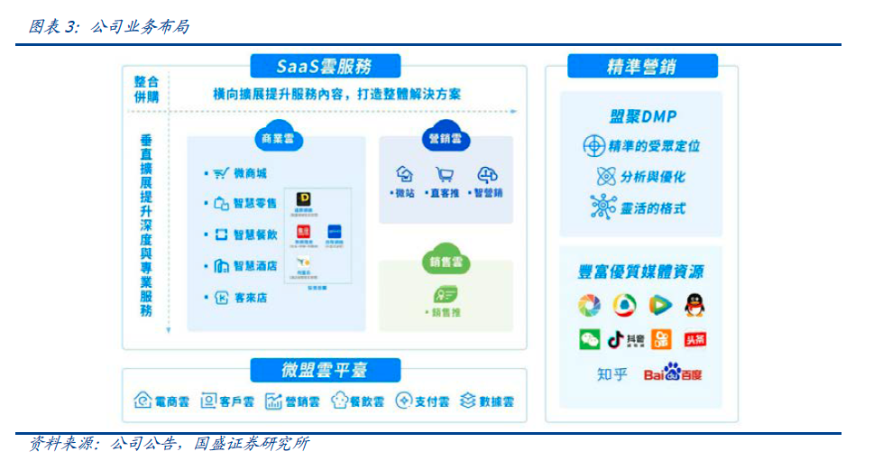 微盟的核心业务是为微信等生态的商家提供SaaS和精准营销代理服务;同时微盟旗下微盟云平台通过开放微盟核心产品技术能力,吸引第三方开发者打造云端生态体系。微盟的SaaS服务围绕商业云、营销云、销售云为商家提供微信生态的电商、本地生活、营销和销售管理等全套解决方案,产品包括微商城、智慧零售、智慧餐饮、智慧酒店、微盟外卖、微站、直客推、智营销、销售推等。微盟的精准营销业务通过盟聚DMP与丰富的媒体资源如微信、QQ、抖音等,为广告主提供一站式精准营销投放服务。