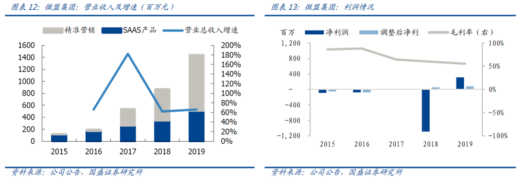 近年公司营收始终保持高速增长。2019年微盟集团录得收入14.4亿元,同比增长66%;其中,SaaS业务和精准营销业务各贡献收入的35%和65%。