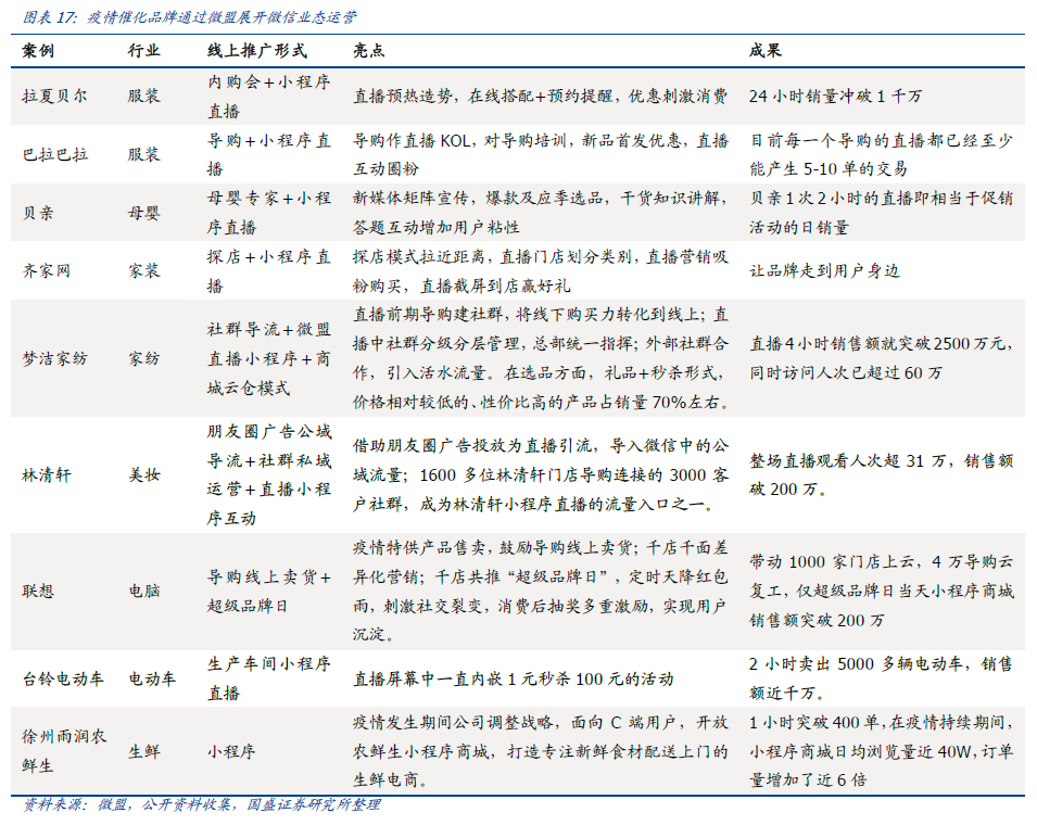 为了加速业务回血,大量线下品牌开始通过微盟等渠道在微信生态进行私域流量带货销售;包括服装、母婴、家纺、美妆、电脑、电动车、生鲜等行业,线上推广形式多样。比如,台铃电动车通过微盟在生产车间开展直播活动,直播2小时卖出5000多辆电动车,销售额近千万。更有微盟长期商家如林清轩加大业务推广力度,通过“朋友圈广告公域导流+社群私域运营”的形式开展小程序直播,整场直播观看人次超31万,销售额破200万。