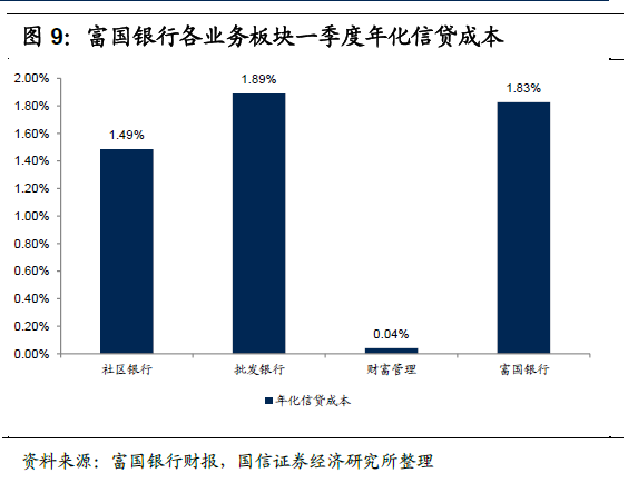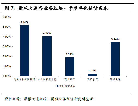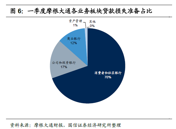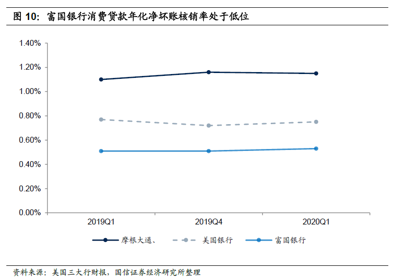 从摩根大通和富国银行各业务板块来看拨备计提的情况,摩根大通的消费者和社区银行(大零售板块)计提的贷款损失准备占比达70%,年化信贷成本为5.14%,明显高于3.44%的整体水平。富国银行的社区银行和批发银行计提的贷款损失准备占比分别为43%和57%,一季度年化信贷成本分别为1.49%和1.89%。富国银行的批发银行贷款损失准备计提力度更大,主要是富国银行的社区银行扎根社区,且个贷中高风险的信用卡占比不到10%,因此社区银行信贷资产质量得以控制在较高的水平,富国银行消费贷款年化坏账净核销率低于美国银行和摩根大通。