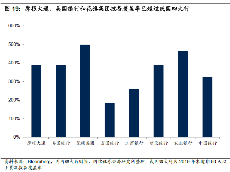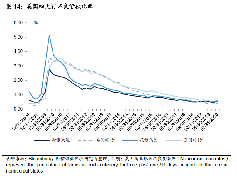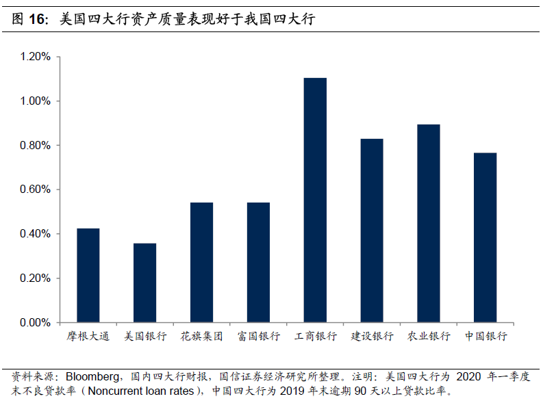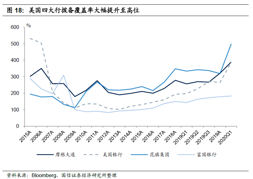 2020年一季度末摩根大通、美国银行、花旗集团和富国银行拨备覆盖率分别为389.2%、388.7%、498.2%和183.0%,较年初分别提升了68个、124个、179个和4个百分点。与国内四大行逾期90天以上贷款拨备覆盖率比较,一季度末摩根大通、美国银行和花旗集团拨备覆盖率已超过我国四大行2019年末逾期90天以上贷款拨备覆盖率水平。