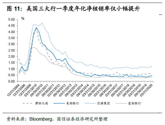 从不良贷款(Noncurrent loans,指逾期90天及以上仍计息贷款加上非应计贷款)率来看,一季度末摩根大通、美国银行、和富国银行不良贷款率分别为0.59%、0.38%和0.60%,较年初分别提升了16bps、3bps和5bps,花旗集团不良贷款率为0.53%,较年初下降了1bp,四大行不良贷款率均处于历史较低水平。